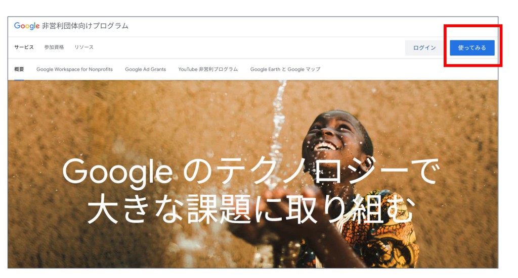 GoogleforNonprofitの公式サイトから「使ってみる」で登録画面に入り、登録情報を入力後、申請します。