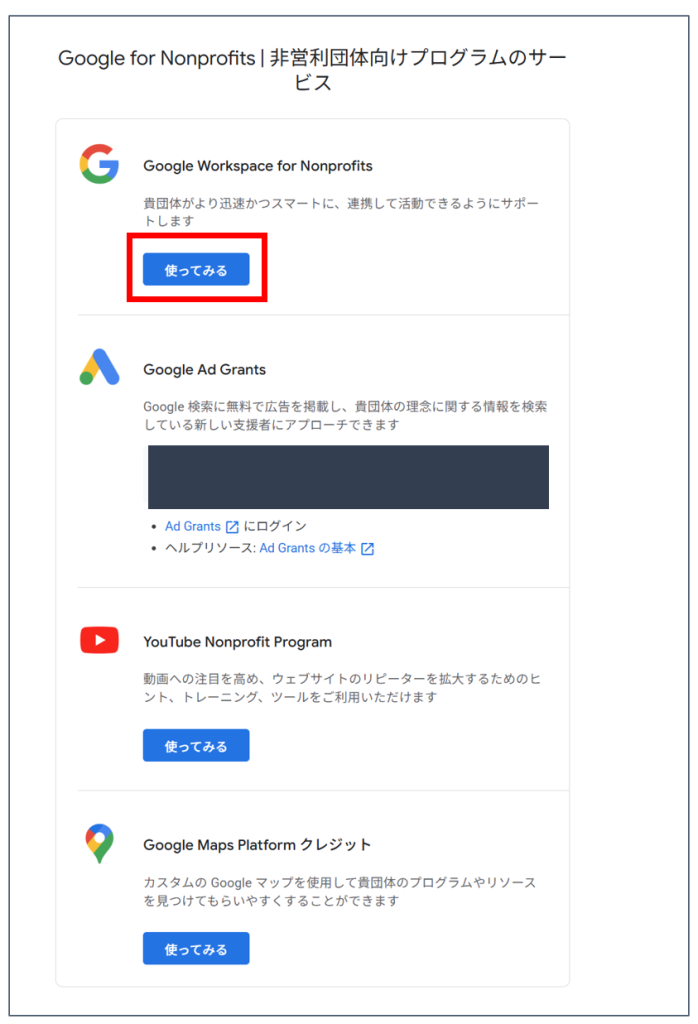 Google for Nonprofitsに参加すると、以下のようなサービスが利用可能です。
