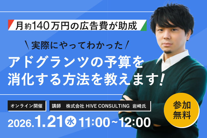 そこで本セミナーでは、今回は1年間アドグランツを実際に運用された株式会社 HIVE CONSULTING様をお招きして、予算消化率を最大限に高めるコツを、ノウハウに基づいてお話いただきます。